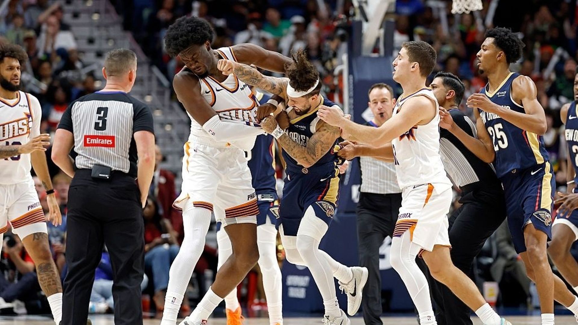 Dans une NBA de plus en plus réglementée, ce sont des images qu'on n'a plus l'habitude de voir. Visiblement très tendus, José Alvarado et Mark Williams se sont battus à la fin du 3e quart-temps du match opposant Phoenix à New Orleans cette nuit. A la base de l'action, le meneur de poche des Pelicans...