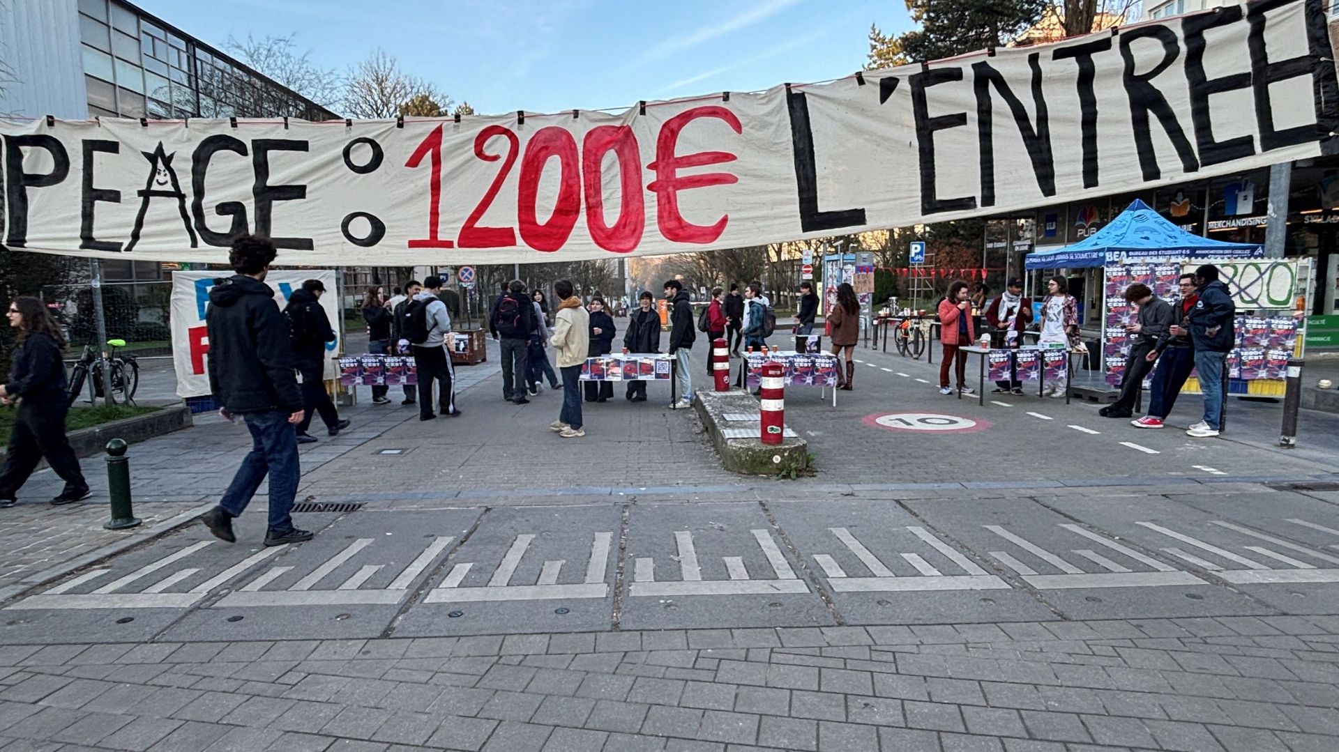 Les étudiants du campus du Solbosch de l’ULB ont été accueillis par une fausse barrière de péage, ce mercredi matin, où ils étaient invités à payer leurs cours à l’aide d’un faux billet de 1200 euros, en référence au projet de réforme qui, si elle devait se concrétiser, pourrait entrer en vigueur dè...