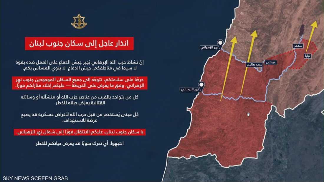 إسرائيل تنذر سكان جنوب نهر الزهراني في لبنان بالإخلاء الفوري