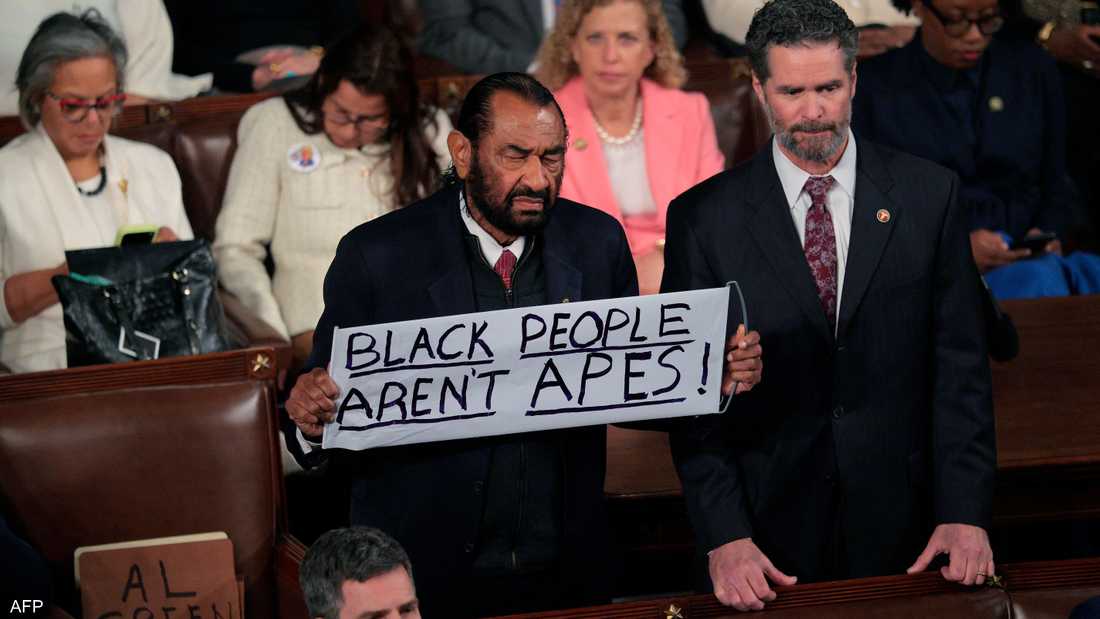 رفع نائب ديمقراطي من أصل إفريقي لافتة كتب عليها "السود ليسوا قرودا" خلال إلقاء الرئيس الأميركي دونالد ترامب خطاب حالة الاتحاد أمام الكونغرس مساء الثلاثاء، قبل أن يتم اقتياده خارج القاعة. Advertisement...