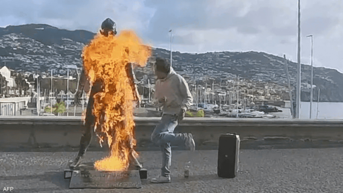 شاب يشعل النار في تمثال رونالدو ويوجه له "رسالة غريبة"