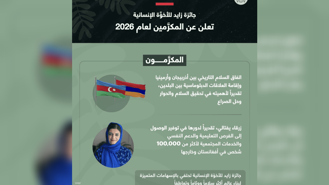 أعلنت جائزة زايد للأخوّة الإنسانية عن المُكرَّمين بالجائزة في دورتها السابعة، وهما، اتفاق السلام التاريخي بين أذربيجان وأرمينيا، وزرقاء يفتالي المُناصِرة الأفغانية لتعليم النساء، ليكونا بذلك أول الـمُكرَّمين بالجائزة من منطقة القوقاز وأفغانستان. Advertisement...
