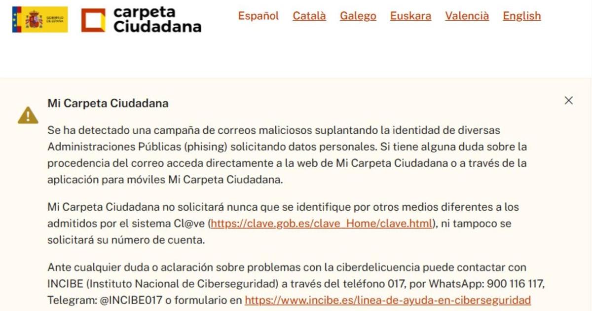 Alertan sobre una campaña de 'phishing' que suplanta 'Mi Carpeta Ciudadana' para robar datos bancarios