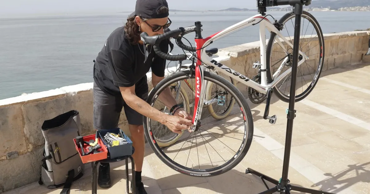 Como un artesano rodante, Nacho Rodríguez revisa y pone a punto todo tipo de bicicletas a domicilio, en playas, terrazas y plazas...