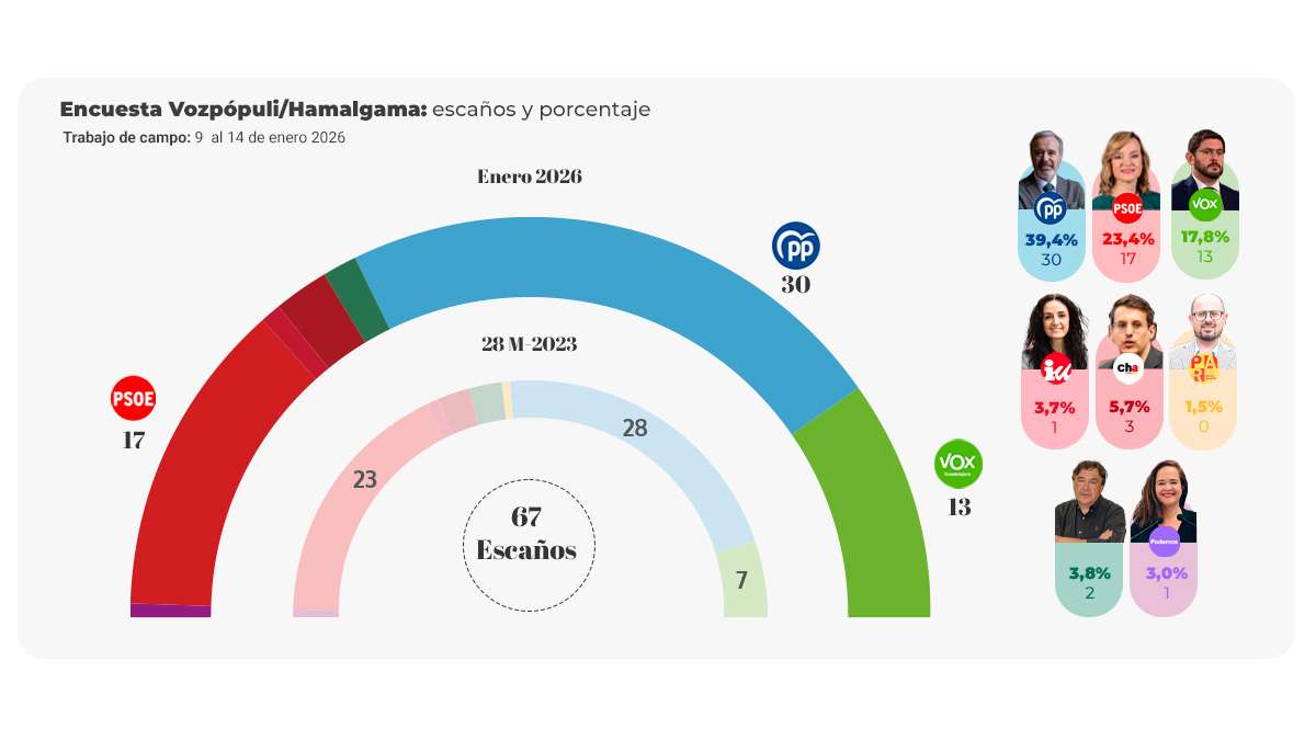 La última encuesta de Hamalgama Métrica para Vozpópuli otorga 30 escaños a Jorge Azcón, a cuatro de la absoluta, confirmando la subida a 13 diputados de Vox...