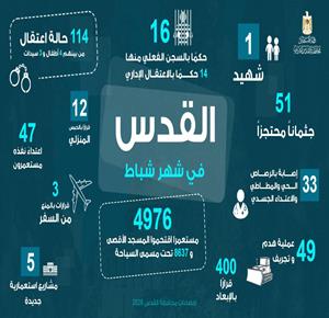 - 114 حالة اعتقال و49 عملية هدم وتجريف بالمدينة القدس 2-3-2026 وفا– رصدت محافظة القدس خلال شهر شباط 2026 تصعيدا واسعا في جرائم الاحتلال الإسرائيلي في المدينة، تمثل في ارتقاء شهيد، واقتحام 4976 مستعمرا للمسجد الأقصى المبارك، وتسجيل 114 حالة اعتقال، وأكثر من 400 قرار إبعاد، إضافة إلى 49 عملية هدم وتج...