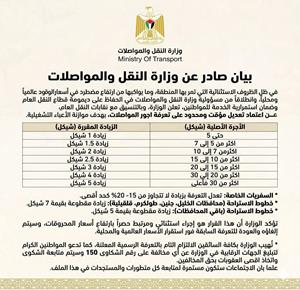 رام الله 1-4-2026 وفا- أعلنت وزارة النقل والمواصلات، اليوم الأربعاء، اعتماد تعديل مؤقت ومحدود على تعرفة أجور المواصلات العامة، وذلك في ظل الظروف الاستثنائية التي تمر بها المنطقة، وما يرافقها من ارتفاع متواصل في أسعار المحروقات عالمياً ومحلياً. وأوضحت الوزارة، في بيان، أن القرار جاء بالتنسيق مع نقاب...