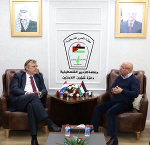 رام الله 2-4-2026 وفا- بحث عضو اللجنة التنفيذية لمنظمة التحرير الفلسطينية، رئيس دائرة شؤون اللاجئين أحمد أبو هولي، خلال لقائه رئيس بعثة الممثلية الهولندية لدى دولة فلسطين، السفير ميشيل رينتنار، أوضاع المخيمات الفلسطينية وسبل دعم حقوق اللاجئين وتحسين ظروفهم المعيشية، والتحديات الوجودية والأزمات المال...