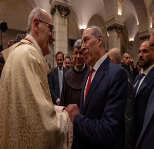 بيت لحم - بحضور نائب الرئيس حسين الشيخ: بطريرك القدس للاتين الكاردينال بييرباتيستا بيتسابالا، يترأس قداس منتصف الليل لعيد الميلاد المجيد في كنيسة القديسة كاترينا للاتين المحاذية لكنيسة المهد في بيت لحم