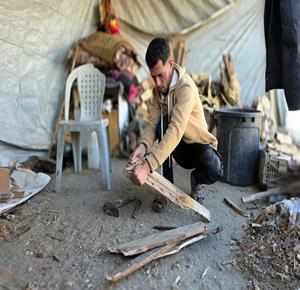 غزة - نازحون في خان يونس جنوب قطاع غزة يستخدمون الحطب لإعداد الطعام بسبب شحّ غاز الطهي ما يعرّض خيام النازحين لخطر الاحتراق، ويهدّد الأطفال وكبار السن بمخاطر صحية جرّاء الدخان المتصاعد