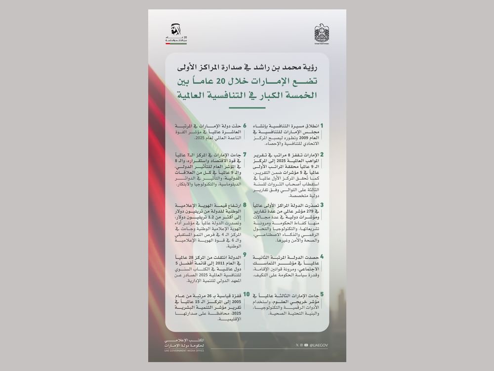 رؤية محمد بن راشد في صدارة المراكز الأولى تضع الإمارات خلال 20 عاماً بين الخمسة الكبار في التنافسية العالمية