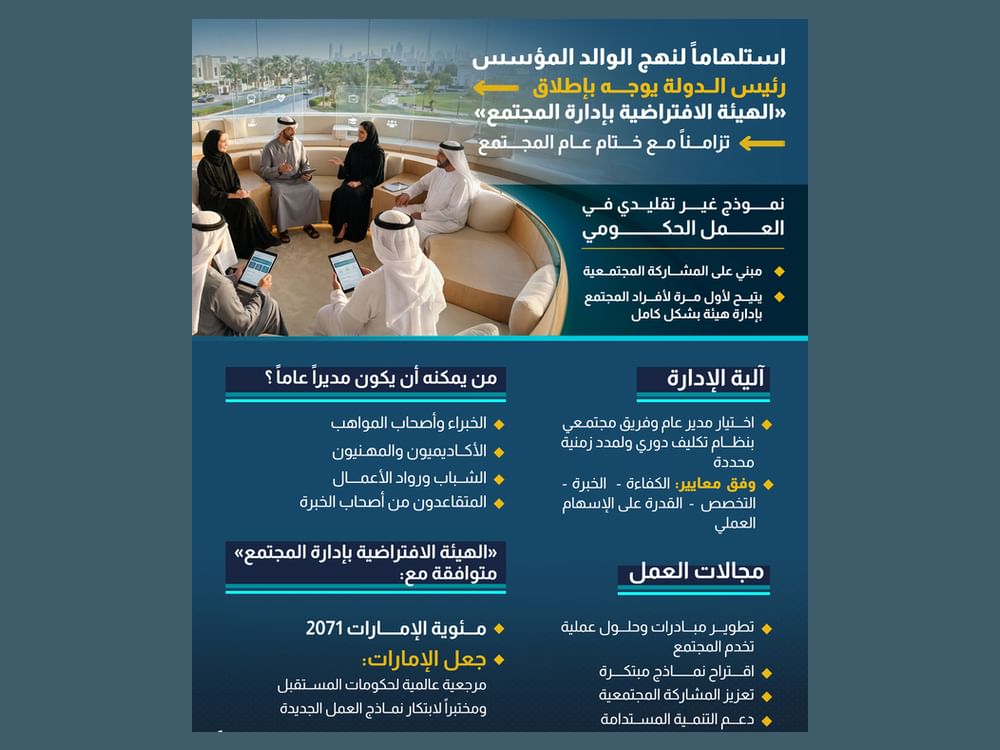 استلهاما لنهج الوالد المؤسس.. رئيس الدولة يوجه بإطلاق "الهيئة الافتراضية بإدارة المجتمع" تزامنا مع ختام "عام المجتمع"