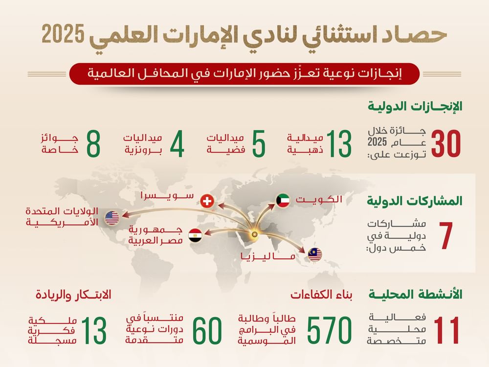نادي الإمارات العلمي يحصد 30 جائزة عالمية خلال 2025 ويعزّز حضور الدولة دوليا