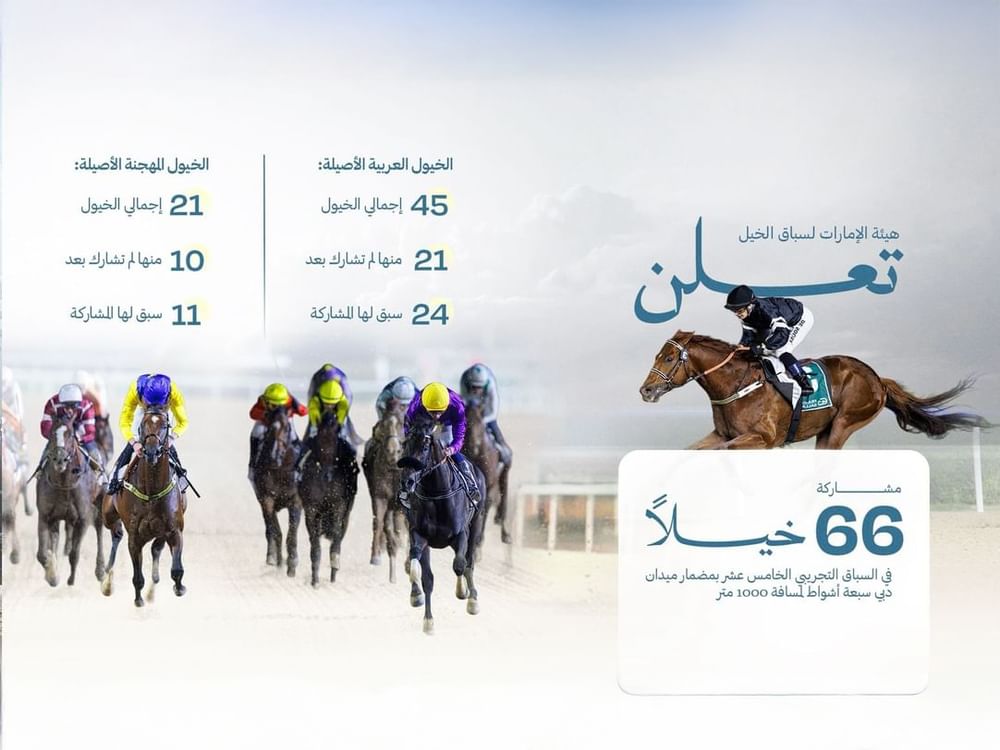 دبي في 7 يناير/وام/ أعلنت هيئة الإمارات لسباق الخيل، مشاركة 66 من الخيول العربية والمهجنة الأصيلة، في السباق التجريبي الـ15 مساء اليوم، والمؤلف من 7 أشواط لمسافة 1000 متر، على مضمار ميدان بدبي. وأوضحت في بيان لها مشاركة 45 من الخيول العربية، في 5 أشواط، من بينها 21 لم يسبق لها المشاركة في السباقات،...