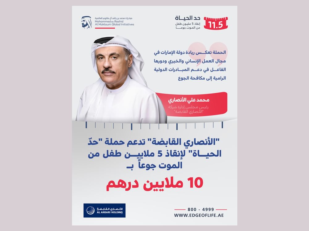 10ملايين درهم من "الأنصاري القابضة" دعماً لحملة "حدّ الحياة" لإنقاذ 5 ملايين طفل من الموت جوعاً
