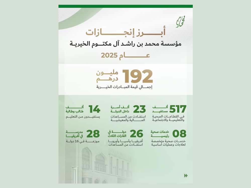 192 مليونا و600 ألف درهم مساعدات مؤسسة محمد بن راشد آل مكتوم الخيرية لـ26 دولة خلال 2025