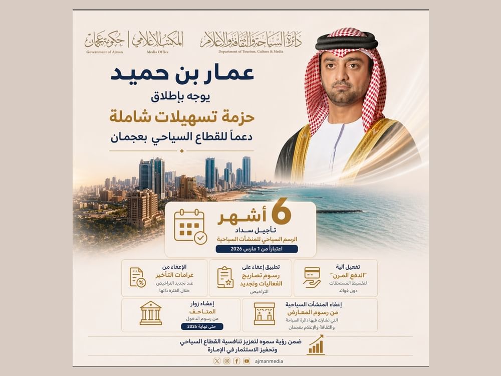 بتوجيهات عمار بن حميد .. عجمان تطلق حزمة تسهيلات شاملة دعماً للقطاع السياحي