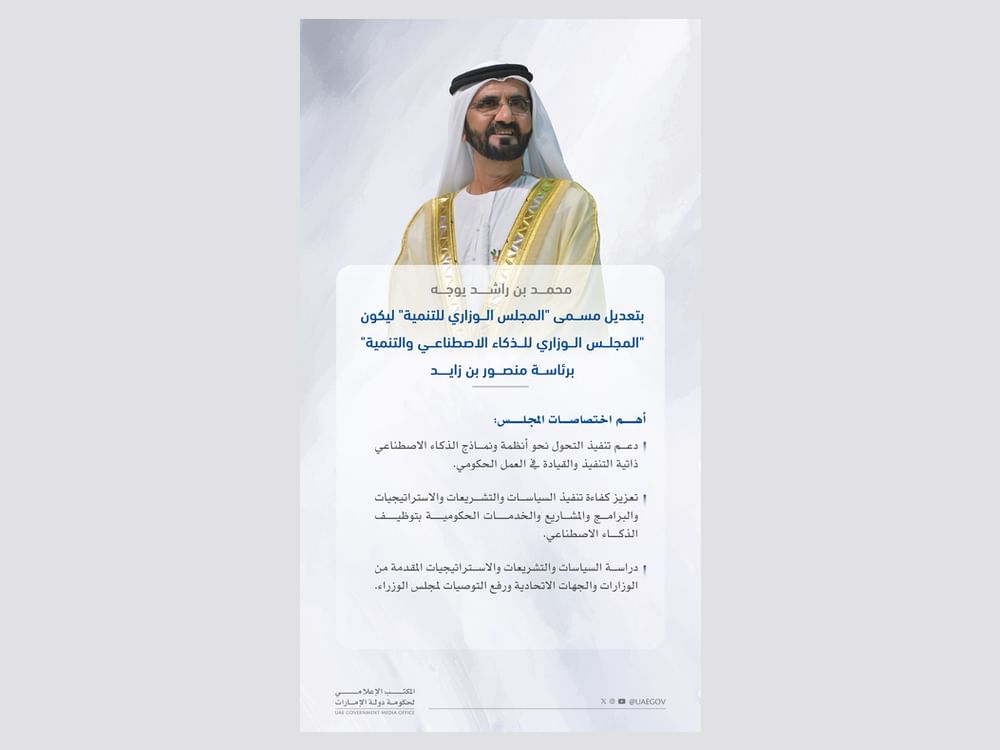 محمد بن راشد يوجه بتعديل مسمى "المجلس الوزاري للتنمية" ليكون "المجلس الوزاري للذكاء الاصطناعي والتنمية" برئاسة منصور بن زايد