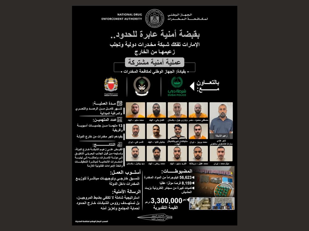 أبوظبي في 29 أبريل/ وام/ أعلن الجهاز الوطني لمكافحة المخدرات في دولة الإمارات العربية المتحدة، أنه نجح في تنفيذ عملية مشتركة مع شرطة دبي والشارقة ومملكة البحرين، استمرت لمدة شهر، أسفرت عن ضبط عصابة إجرامية مكونة من 13 متهماً يحملون الجنسية الآسيوية والأفريقية، يقودها تاجر مخدرات من الجنسية الآسيوية...