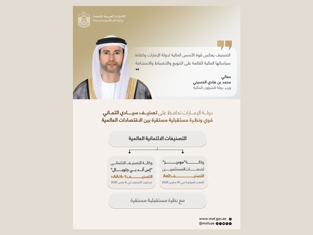 الإمارات تحافظ على تصنيف Aa2 مع نظرة مستقبلية مستقرة وفق مراجعة دورية من وكالة "موديز للتصنيف الائتماني"