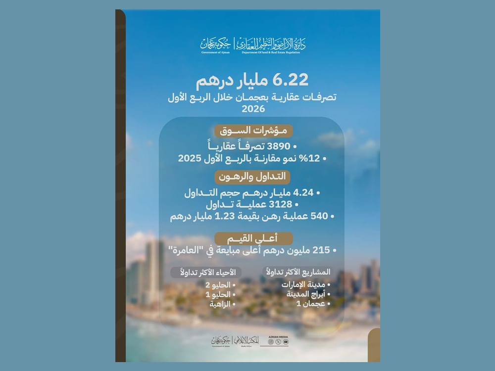 عجمان في 8 أبريل/ وام/ بلغت قيمة التصرفات العقارية في عجمان خلال الربع الأول من العام الجاري 6.22 مليار درهم، من خلال 3890 تصرفاً عقارياً، محققة نمواً بنسبة 12% مقارنة بالفترة ذاتها من عام 2025، فيما بلغ حجم التداول 4.24 مليار درهم عبر 3128 عملية تداول. وقال الشيخ عبدالعزيز بن حميد النعيمي، رئيس دا...