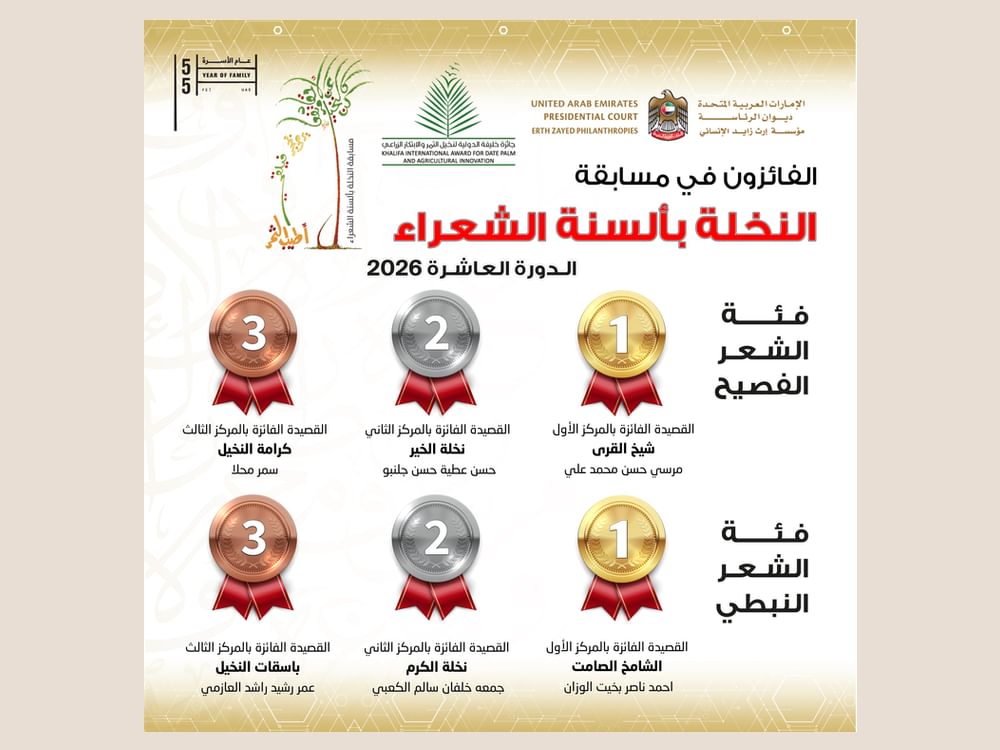 أبوظبي في 13 أبريل/ وام / أعلنت الأمانة العامة لجائزة خليفة الدولية لنخيل التمر والابتكار الزراعي، التابعة لمؤسسة إرث زايد الإنساني، - ديوان الرئاسة عن أسماء الفائزين في الدورة العاشرة "2026" من مسابقة "النخلة بألسنة الشعراء"، التي تُنظَّم برعاية معالي الشيخ نهيان بن مبارك آل نهيان، وزير التسامح وال...