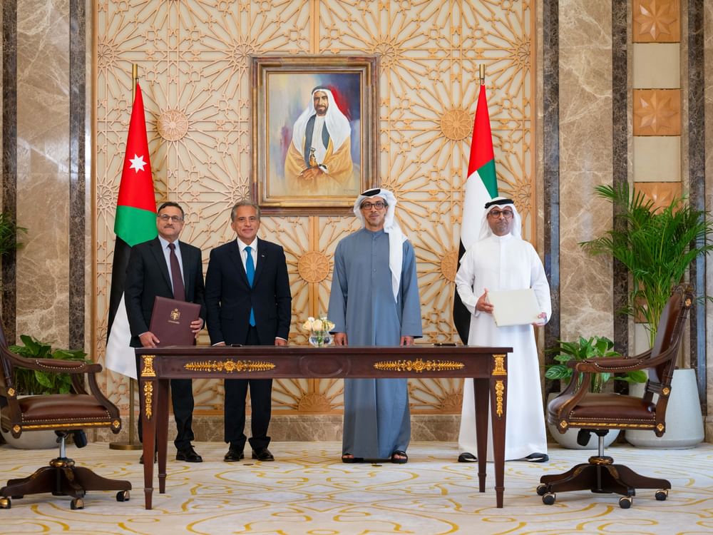 منصور بن زايد ورئيس الوزراء الأردني يشهدان توقيع اتفاقية بين الإمارات و الأردن لإنشاء شبكة سكك حديدية تربط مناطق التعدين بميناء العقبة وتأسيس الشركة الإماراتية الأردنية لسكك الحديد