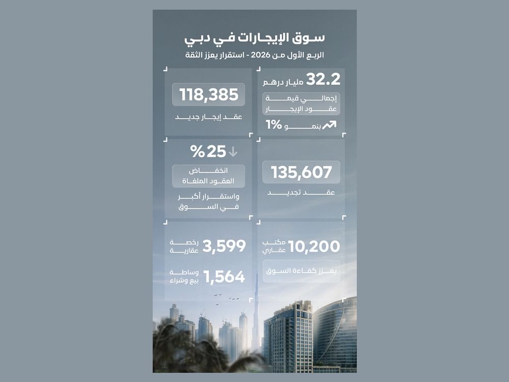 دبي في 19 أبريل/ وام / أكدت مؤشرات سوق الإيجارات في دبي خلال الربع الأول من عام 2026 رسوخ حالة من الاستقرار المدعوم بأسس تنظيمية واقتصادية متينة، إذ حافظ السوق على استمرارية نشاطه ضمن بيئة مرنة قادرة على التكيّف وتعزيز الثقة، وذلك وفقا لبيانات دائرة الأراضي والأملاك في دبي. ويعكس هذا الأداء الرؤية...