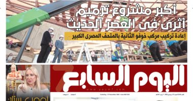 تنشر اليوم السابع فى عددها الصادر غدا، تفاصيل هامة حول العديد من الأحداث الجارية على الساحتين الداخلية والخارجية: أكبر مشروع ترميم أثرى فى العصر الحديث واقرأ أيضًا فى العدد الصادر غدًا: انطلاق تصويت الداخل فى دوائر إعادة المرحلة الأولى لانتخابات «النواب» اليوم صفحة «الداخلية» تتحول إلى منبر شعبى...