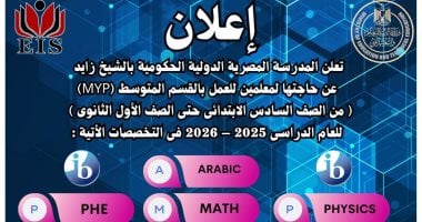 أعلنت المدرسة المصرية الدولية الحكومية بالشيخ زايد، عن حاجتها لـ معلمين للعمل بالقسم المتوسط (MYP) ) من الصف السادس الابتدائى حتى الصف الأول الثانوى ) للعام الدراسي 2025 - 2026. ARABIC PHE MATH PHYSICS DRAMA CHEMISTRY ART SCIENCE SOCIAL WORKER ENGLISH PSYCHOLOGIST RELIGION BIOLOGY SOCIAL STUDIES FR...