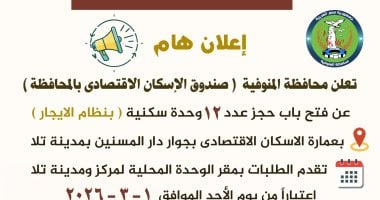 أعلن صندوق الإسكان الاقتصادي بمحافظة المنوفية عن فتح باب الحجز لـ12 وحدة سكنية "بنظام الإيجار" بعمارة الإسكان الاقتصادي بجوار دار المسنين بمدينة تلا، وذلك اعتباراً من يوم الأحد الموافق 1 مارس القادم وحتى 15 مارس 2026، علي ان يتم تقديم الطلبات بمقر الوحدة المحلية لمركز ومدينة تــلا، في إطار توجيهات ا...