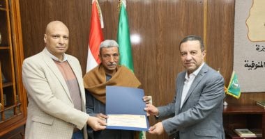 محافظ المنوفية يكرم عاملاً بقسم الحدائق بأشمون لإخلاصه وتفانيه فى العمل