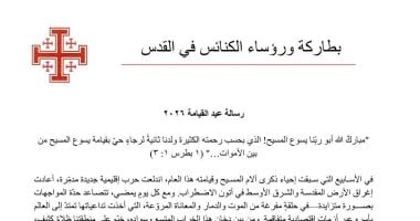 أكد بطاركة ورؤساء الكنائس في القدس، في رسالتهم بمناسبة عيد القيامة لعام 2026، أن الرجاء المسيحي يظل حاضرًا رغم تصاعد الأزمات والحروب في الشرق الأوسط، داعين إلى وقف العنف وإحلال السلام، ومشددين على أن قيامة المسيح تمثل مصدر قوة روحية في مواجهة الألم والمعاناة. وجاء في نص الرسالة أن الأسابيع التي سبق...
