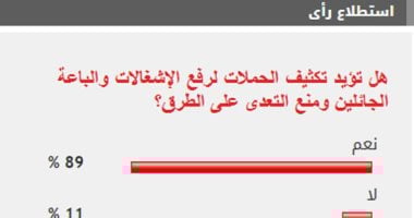 فى استطلاع للرأى طرحه "اليوم السابع" تحت عنوان هل تؤيد تكثيف الحملات لرفع الإشغالات والباعة الجائلين ومنع التعدى على الطرق؟، أيد غالبية القراء مطالب تكثيف الحملات لرفع الإشغالات والباعة الجائلين ومنع التعدى على الطرق. وأيد 89% من القراء مطالب تكثيف الحملات لرفع الإشغالات والباعة الجائلين ومنع التعد...