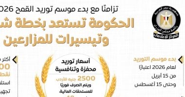 نشر المركز الإعلامي لمجلس الوزراء إنفوجرافًا عبر منصاته على مواقع التواصل الاجتماعي، استعرض من خلاله استعدادات الحكومة وخطتها الشاملة لاستقبال موسم توريد القمح 2026. ويأتي ذلك في إطار جهود الدولة لتعزيز الإنتاج المحلي من المحاصيل الاستراتيجية، ودعم المزارعين، إذ تكثف الحكومة استعداداتها لانطلاق موس...
